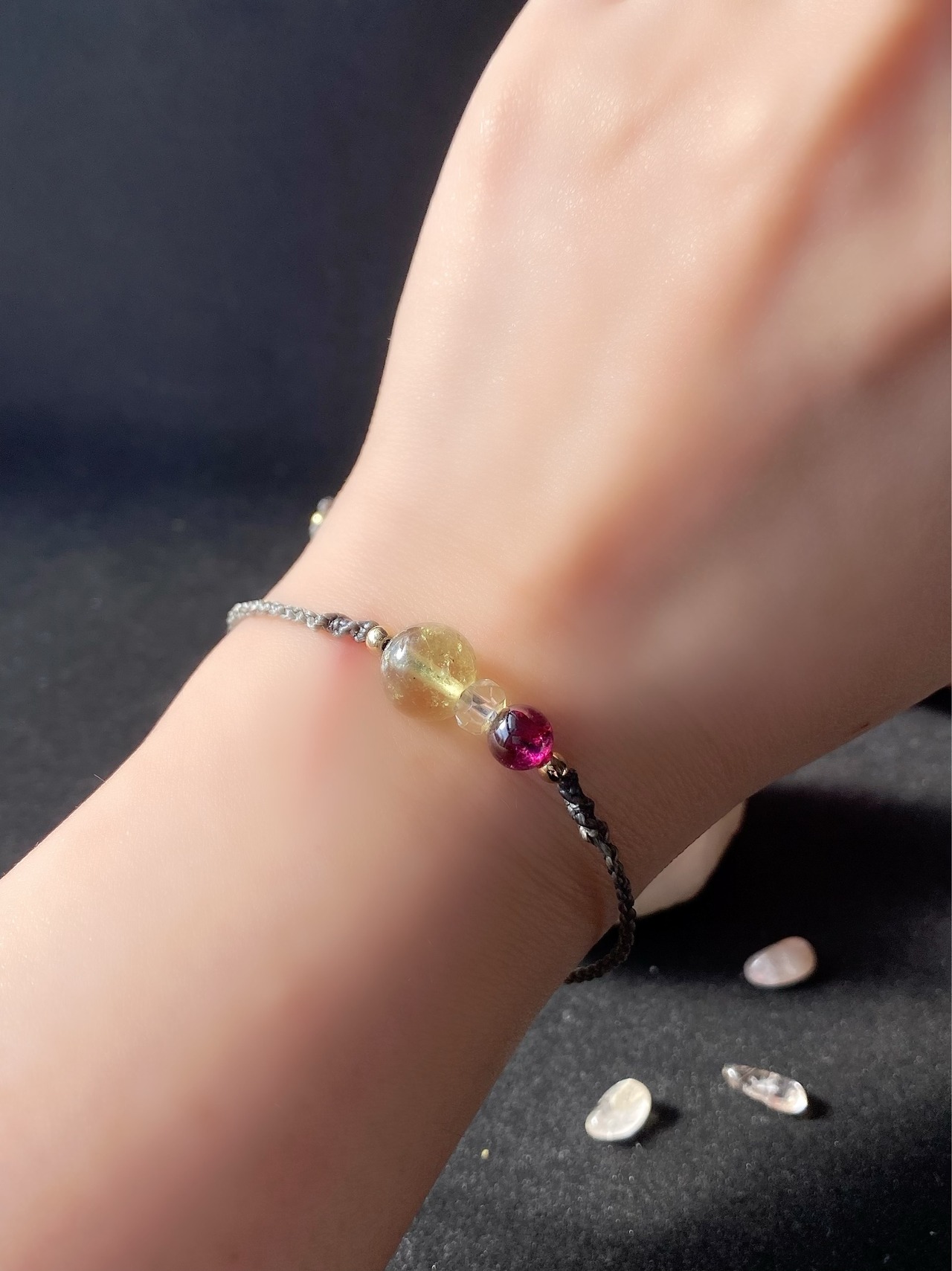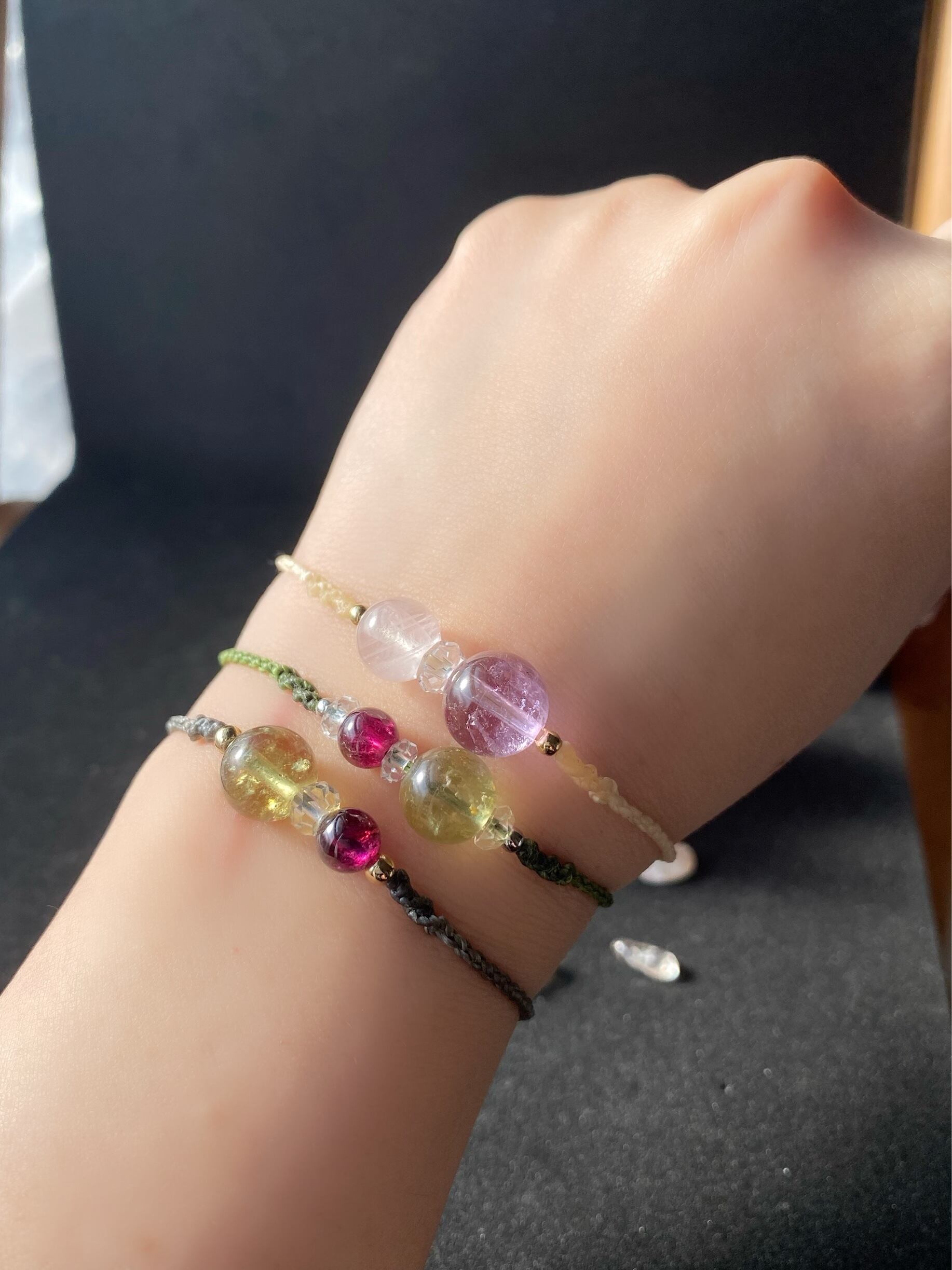 グリーンガーネット、ロードナイトガーネット、水晶を使ったマクラメブレスレットです。